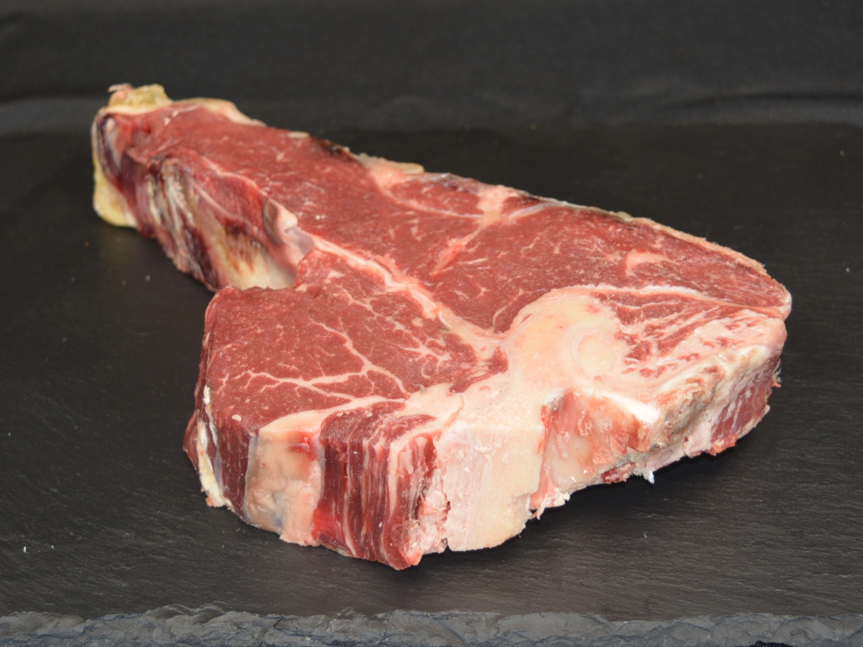 T-Bone — pièce généreuse réunissant filet et faux-filet, idéale au barbecue ou à la plancha. À partager, relevée d’un beurre maître d’hôtel et accompagnée de légumes grillés.
