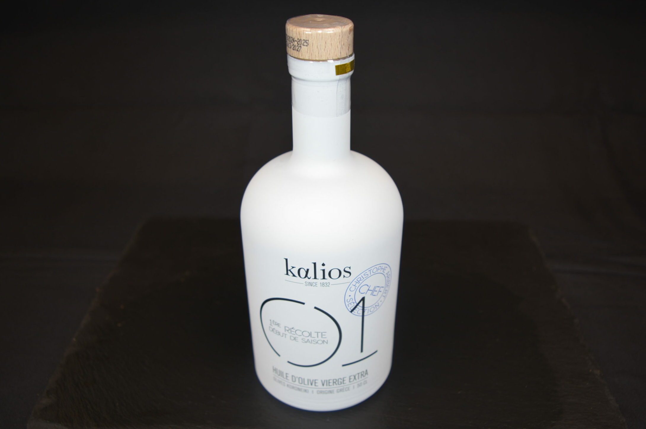 Christophe Aribert**, chef doublement étoilé, a sélectionné pour vous l’huile d’olive vierge extra Kalios 01. Une huile monovariétale produite à partir d’olives Koroneiki fraîchement récoltées vertes en début de saison, en Grèce. Elle dévoile des arômes intenses et de belles notes poivrées en fin de bouche.